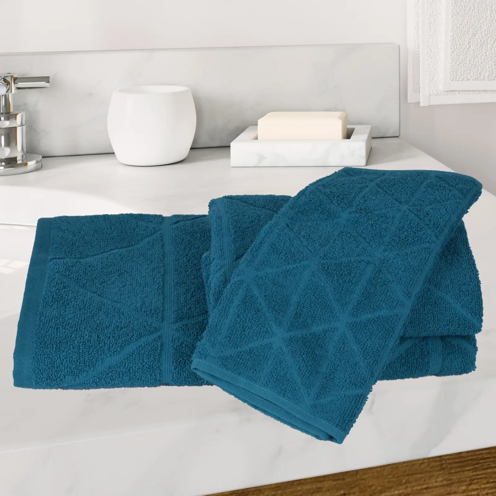 Преобразете атмосферата в банята с хавлиена кърпа „Фюжън“ в наситен тюркоазен цвят. Този модел се отличава с модерен, изцяло релефен дизайн на геометрични фигури, който придава дълбочина, артистичност и усещане за лукс на интериора.