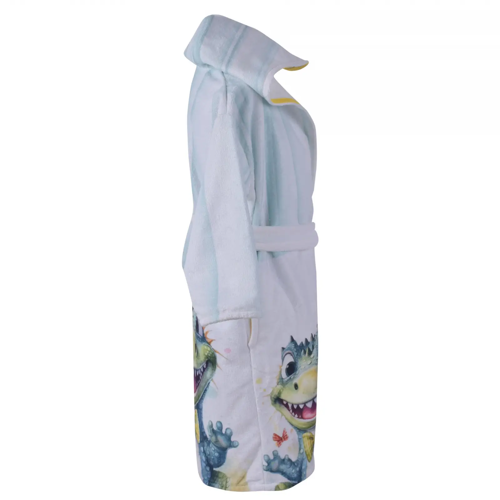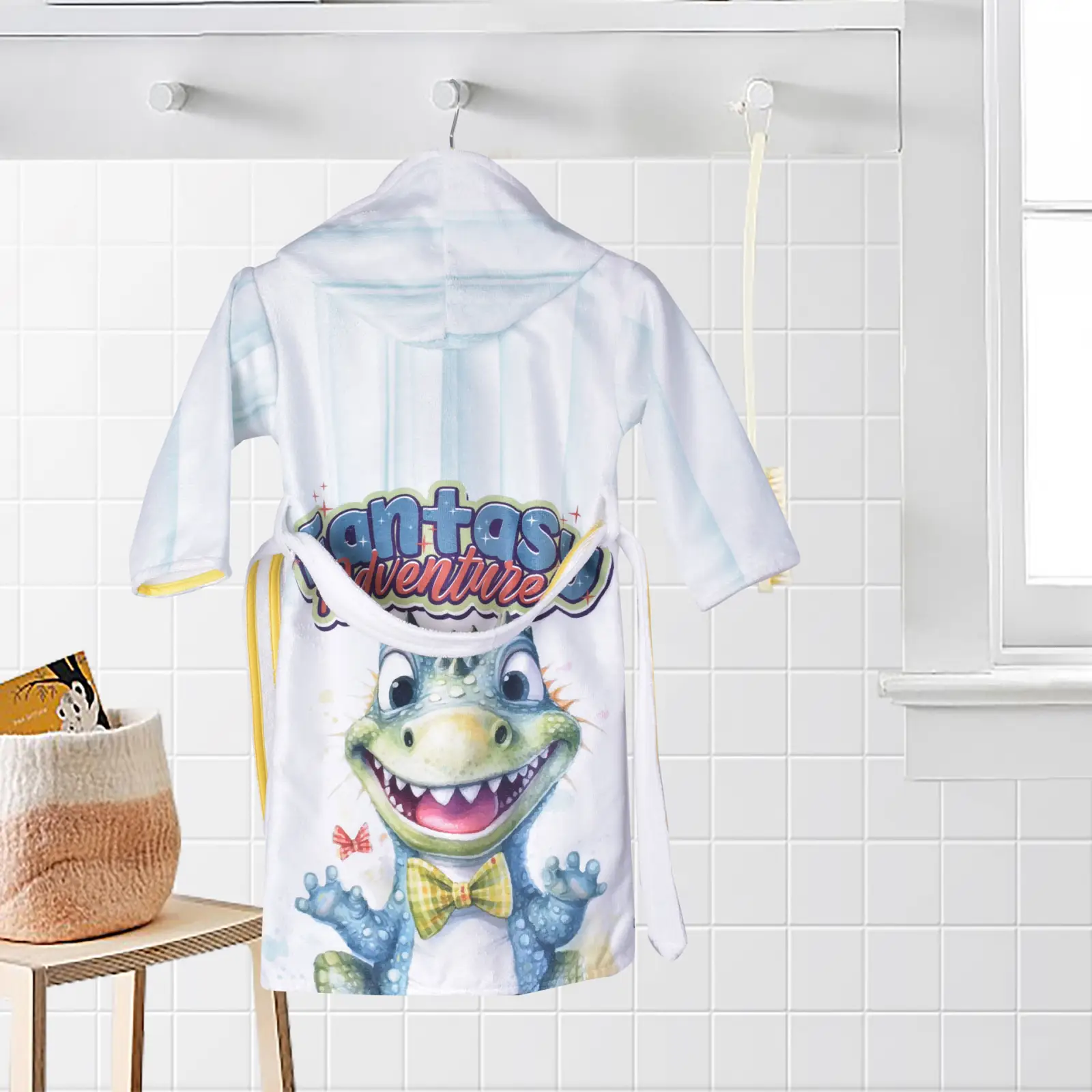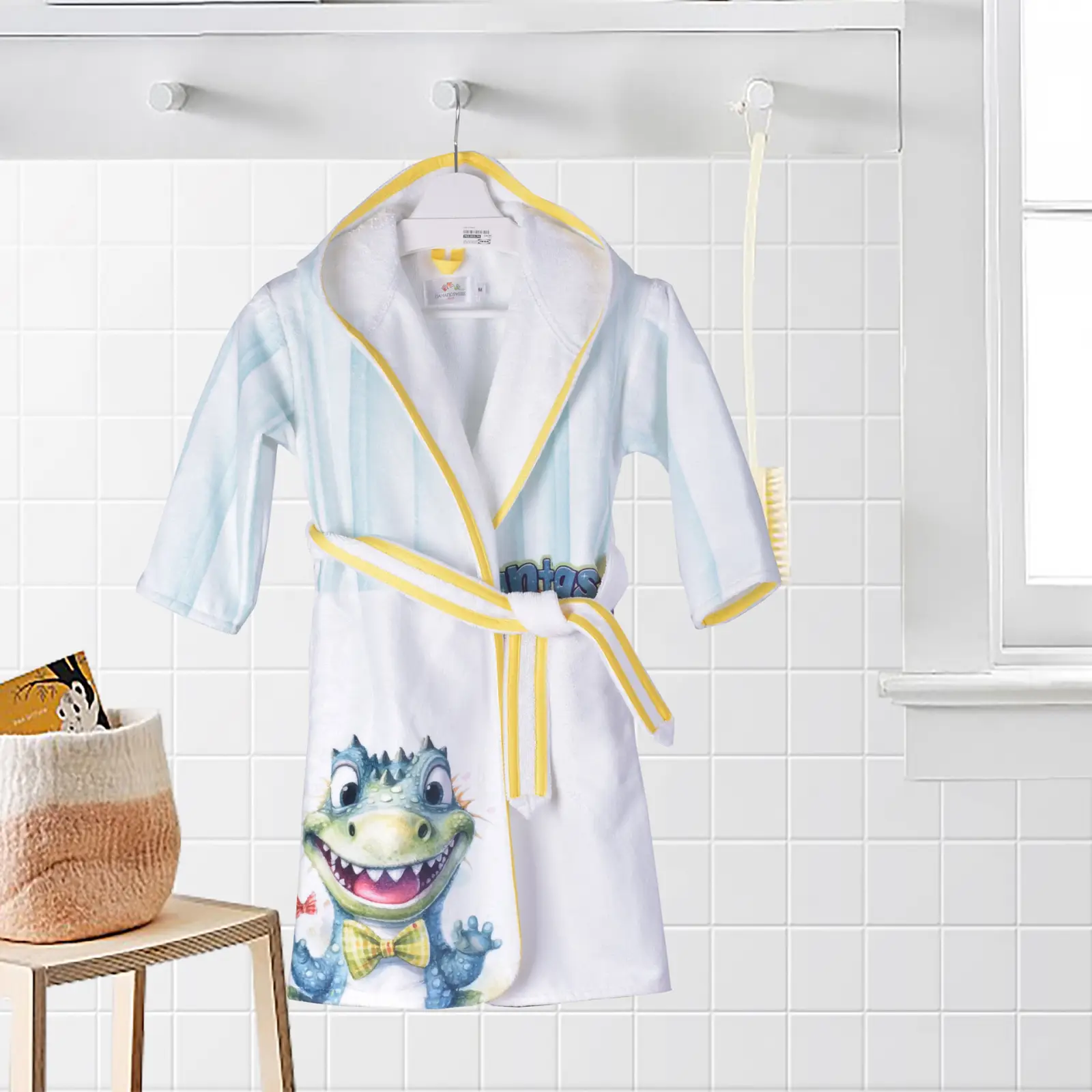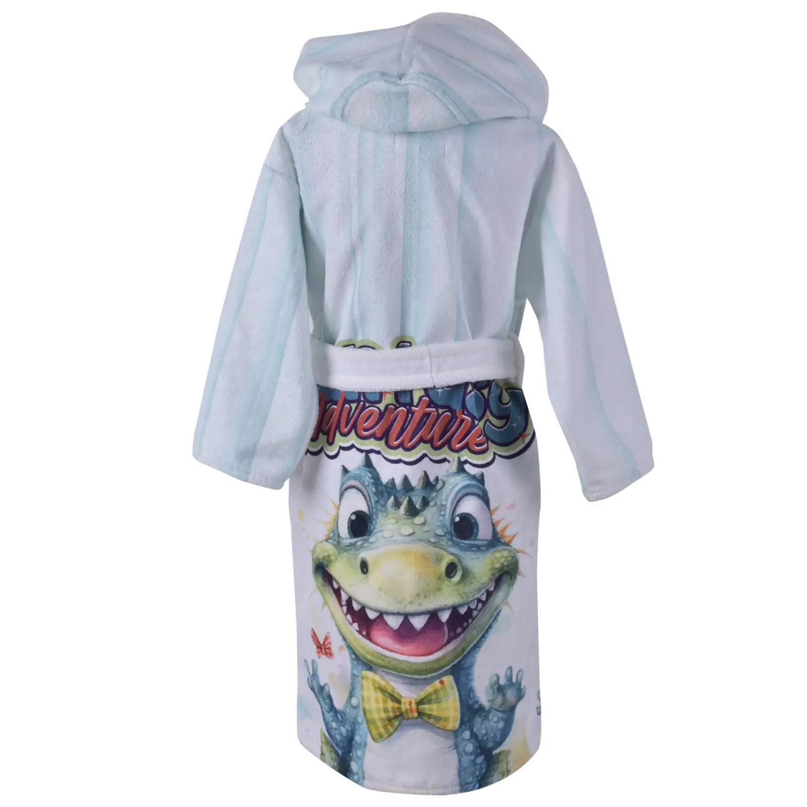 Превърнете времето след баня във весело приключение с Детски халат „Кроки“! Този очарователен модел грабва вниманието с усмихнато крокодилче и надпис „Fantasy Adventure“ на гърба, а свежите жълти акценти по коланчето и качулката носят настроение.